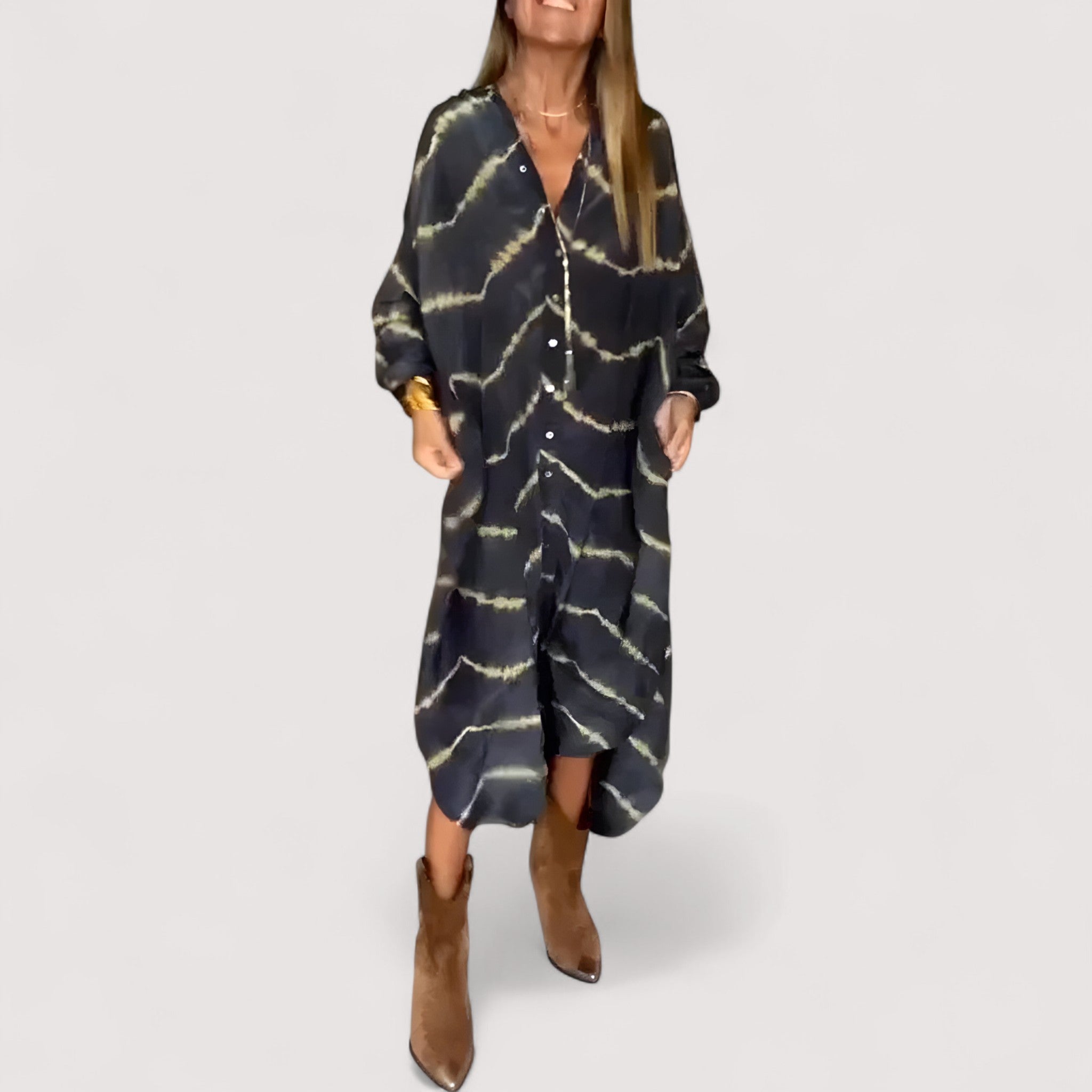 Dieses Maxikleid kombiniert einen Hauch Boho mit purer Eleganz und betont Ihre natürliche Schönheit durch ein schmeichelhaftes Design und ein stilvolles Muster. Perfekt für jede Gelegenheit, bei der Komfort auf mühelosen Stil trifft.