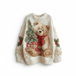 Der Weihnachts-Pullover Elena ist aus weichem Garn gestrickt, mit niedlichen Details von Bären, Geschenken und winterlicher Vegetation, leicht erhaben für einen einladenden Effekt. Die Rippbündchen an Kragen, Ärmeln und Saum sorgen für Komfort und halten die Form.