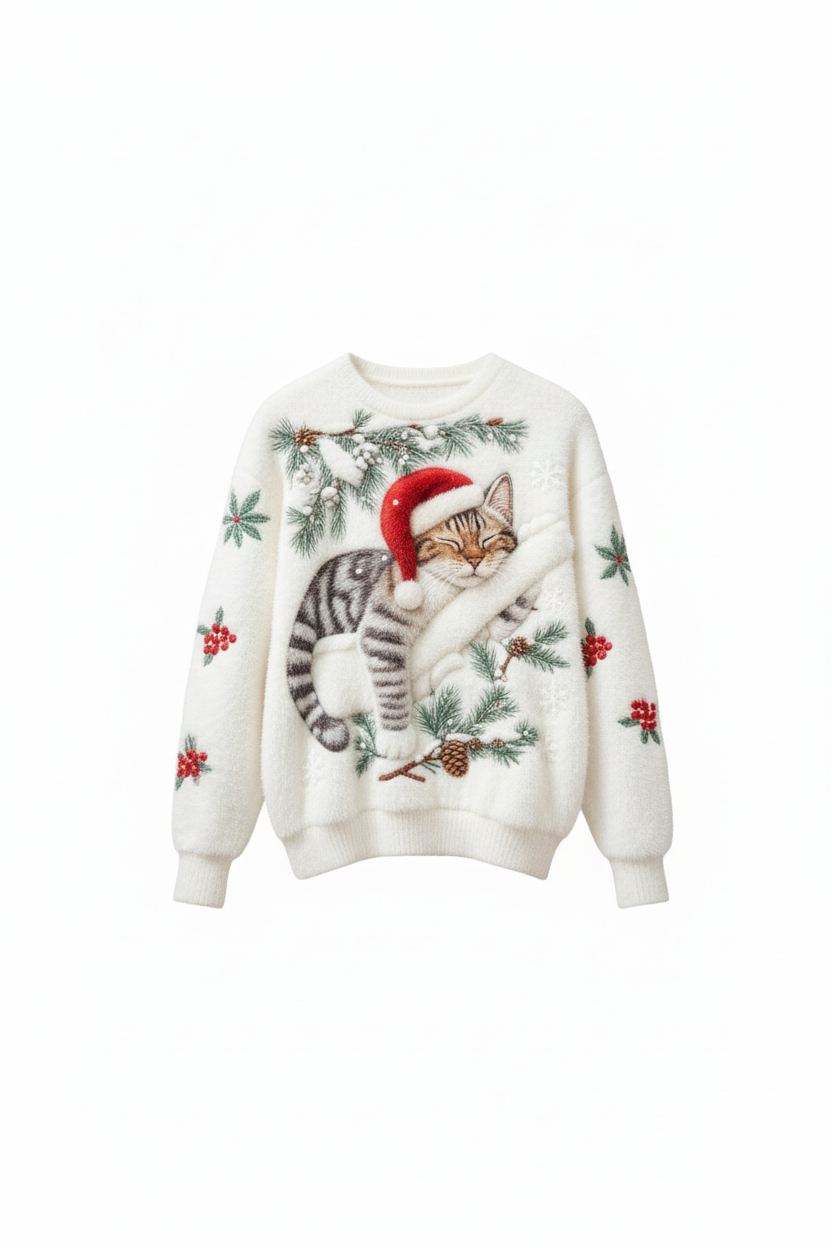 Dieser gemütliche festliche Pullover vereint Wärme, Charme und einen saisonalen Charakter, mit einer wunderschön detaillierten Katze, die in einer winterlichen Szene ruht. Die weiche und flauschige Textur bietet ein premium Gefühl und macht ihn perfekt für entspannte Wintertage oder festliche Zusammenkünfte.
